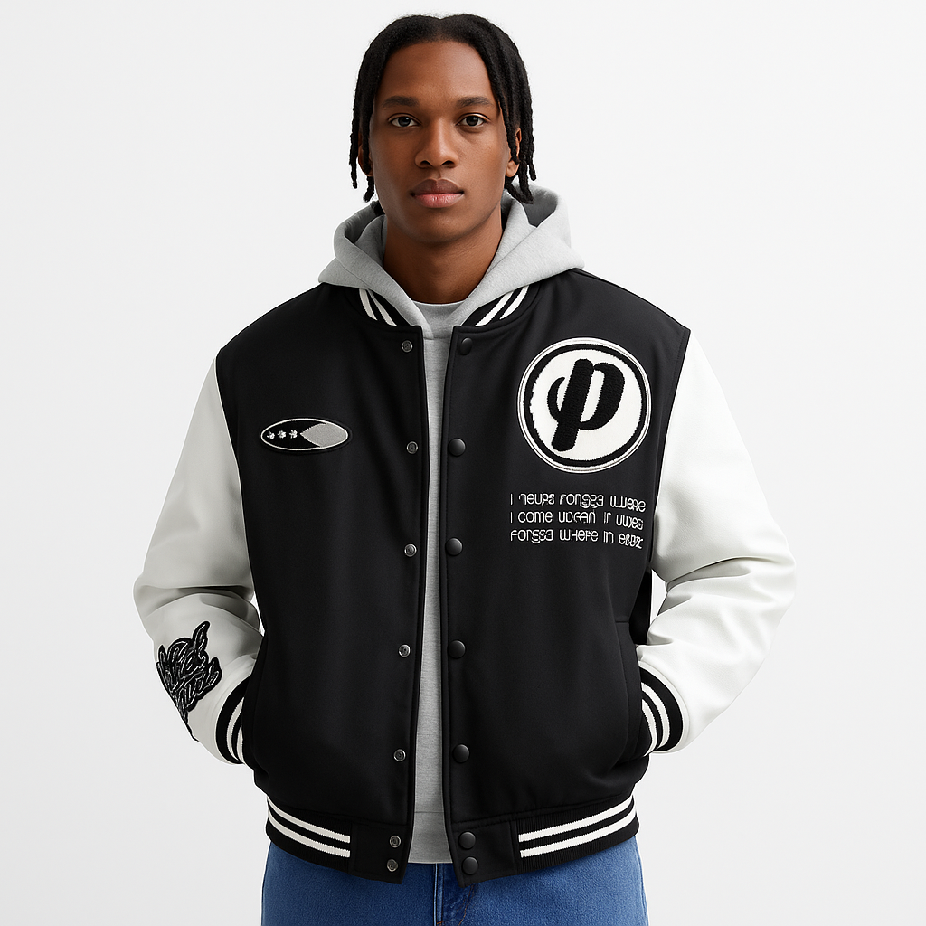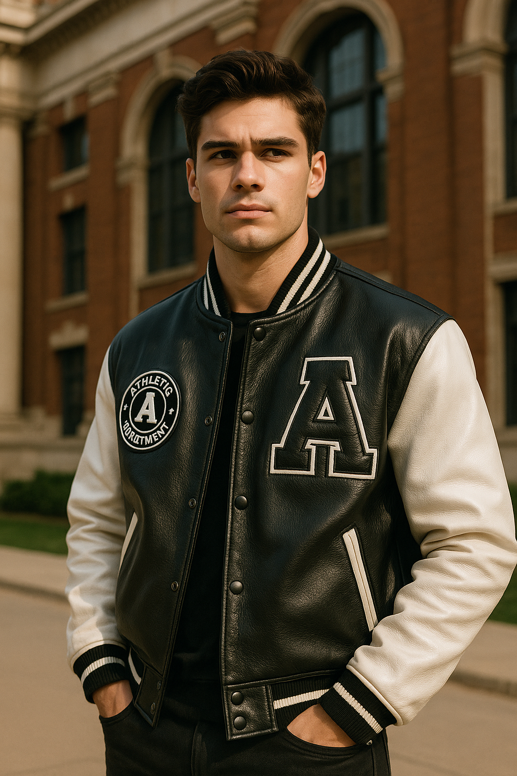 Les amateurs de pièces haut de gamme seront séduits par notre leather varsity jacket, une veste varsity en cuir qui allie robustesse, élégance et authenticité. Ce modèle premium est parfait pour ceux qui veulent une varsity jacket homme au caractère affirmé.