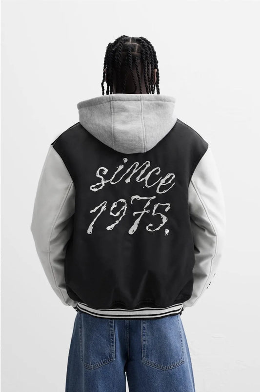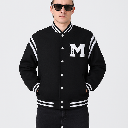 Sport chic : Associe ta veste football américain à un jogging minimaliste et des baskets blanches pour un style décontracté mais soigné.